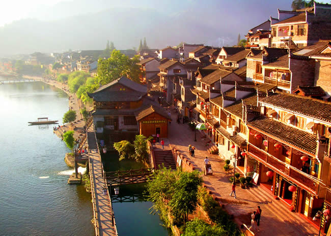 湖南鳳凰古城始建于清康熙四十三年〔1704年〕,歷經(jīng)300多年的風(fēng)雨滄桑,古貌猶存。現(xiàn)東門和北門古城樓尚在。城內(nèi)青石板街道,江邊木結(jié)構(gòu)吊腳樓,以及朝陽宮、古城博物館、楊家祠堂、沈從文故居、熊希齡故居、天王廟、大成殿、萬壽宮等建筑,無不具古城特色。古城以古街為中軸,連接無數(shù)小巷,溝通全城。古街是一條縱向隨勢成線、橫向交錯鋪砌的青石板路,自古以來便是熱鬧的集市,如今更加生機勃勃。鳳凰古城的標志性建筑之一虹橋,原名臥虹橋,歷史悠久。鳳凰古城北門城樓本名“碧輝門”,采用紅砂條石筑砌,既有軍事防御作用,又有城市防洪功能,是古城一道堅固的屏障。鳳凰古街兩邊建筑飛檐斗拱,店鋪中陳設(shè)著琳瑯滿目的民族工藝品,濃濃的古意古韻,透出古街深厚的民族文化底蘊。