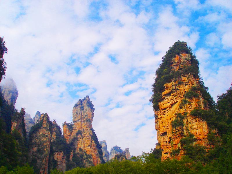 天門山國家森林公園四面絕壁,雄偉壯麗。保存著完整的原始次生林,植物資源豐富,有世界罕見的高山珙桐群落。天門山文化底蘊深厚,留有大量贊詠天門山的詩詞,更有眾多神聞傳說,被譽為“張家界之魂”。山頂天門山寺自唐朝建成以來香火鼎盛,寺外有七級浮屠,掩映于青枝綠葉中,古雅幽清。善男信女入寺拜佛,撞鐘響徹天際,擊鼓震動山岳,香煙裊裊如云。明萬歷年間南岳僧在此傳經(jīng)授戒,從此聞名遐邇,朝山拜佛者達周邊四郡十余縣,信士遍及湘西北,天門山因此成為 “湘西第一神山”。天門山終年云霧繚繞,云海景象變化無窮。山間溶丘、石芽廣布,奇石秀木及珍禽異獸繁多,更有飛瀑流泉噴涌而出。天門山兼峰、石、泉、溪、云、林于一體,集雄、奇、秀、險、幽于一身,被譽為空中原始花園。天門洞、天縫渡仙、五指山、將軍石等是有名的峰林景觀,還有神秘的千佛洞等待你的探奇;山間的韓家溝則是富蘊滿族風(fēng)情的村落——這里久居的幾十戶滿族農(nóng)家至今仍完好保留著其在語言、飲食、衣著、居住以及婚慶殯葬等方面的滿族風(fēng)俗,是難得的民俗文化旅游地。
