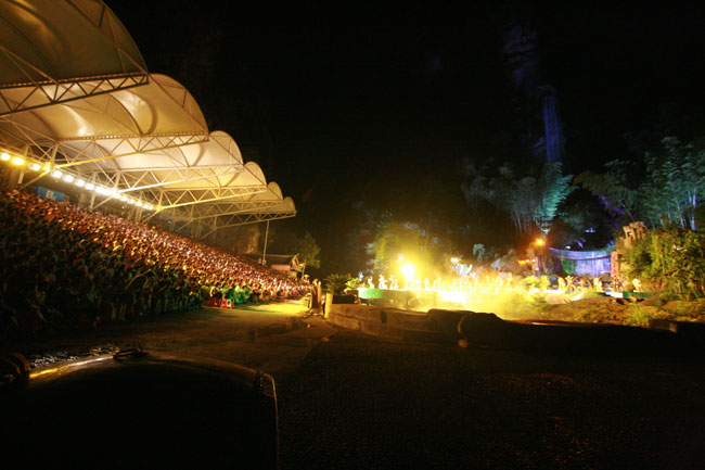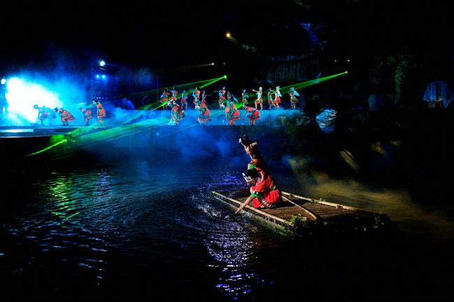 The Ancient Mystical Legend of Zhangjiajie 《武陵魂•梯瑪神歌》是一場記述土家族起源、演變、戰(zhàn)爭、生產(chǎn)生活等內(nèi)容的大型立體山水實景演出,揉合了音樂、舞蹈、文學等多種藝術(shù)形式,如幻如夢的舞美燈光,搖曳生姿的原生態(tài)歌舞……濃縮了土家族數(shù)千年的發(fā)展歷史,400多名演員以自然淳樸的表演充分的展示了土家的民族文化特征,給游客帶來了耳目一新的感受。一場視聽的饕餮盛宴,一曲驚天地、泣鬼神的曠世古歌,給人山水文化光影視聽的享受!境銎罚簭埣医缣莠斏窀栉幕瘋鞑ビ邢薰尽