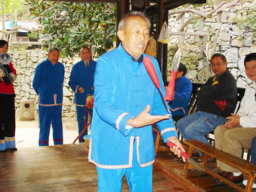三棒鼓,唐代稱三仗鼓,約于明代傳入張家界,并逐漸成為群眾喜聞樂見的民間藝術形式。每年春節(jié),藝人們結(jié)伴走村串寨拜年,表現(xiàn)對象不分貧富,戶戶必到。如遇貧寒之家,表演者將別家贈送的禮品相送,意在人人過節(jié)歡喜。充分體現(xiàn)出土家人熱情好客,心地善良的民族性格。對加強民族間團結(jié)有一定的作用。三棒鼓 通常由三至五人組成,一人擊鼓唱詞,一人鑼鼓配樂,一人耍花棒。花棒三根,長一尺,舞者左右 各執(zhí)一根,將另一根拋在空中,左右開弓,擊打空中花棒使之不落地。也有以刀代棒,以五刀代三棒的技藝。鋼刀在空中歡跳,銀光閃閃,左右穿梭。技藝高強者,突然把刀拋得及高,來一個騰空飛腳,轉(zhuǎn)身外擺,繼續(xù)接刀上拋,令人眼花繚亂,不禁稱絕。打三棒鼓,通常有“鬧春耕”、“收割打場”、“慶豐收”、“拜年節(jié)”四套,分“鯉魚跳龍門”、“玉女穿梭”、“板巖漂灘”等項目。打三棒鼓技巧性強,表演時需高度集中,用力適當,貫通一氣,并與演唱者默契配合。