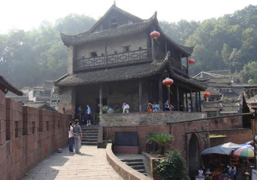 東門城樓始建于清康熙五十四年(1715年),城門下部由紫紅砂巖砌成,上部城樓則用古磚砌筑。城門寬3.5米,高4米,呈半圓拱,兩扇城門都用鐵皮包裹,用圓頭鐵釘密釘,牢實堅固。城墻修筑全部用紅砂條石,精工細鉆,規(guī)格一致,城墻厚0.8米,下部內外兩側用條石加石灰漿砌成,中間填以碎石粘土,層層夯實;頂部的中間填充物改為石灰、鵝卵石、黃土拌成的三合土,厚約0.33米,上面鋪以紅砂塊石。城樓高11米,大門上方有槍眼8孔。歇山屋頂,覆以腰檐,飛檐翹角,精美壯觀。