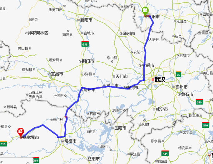 左右,沿途經過信陽——孝感——仙桃——潛江——荊州——常德(也可以走國道經澧縣、石門縣)——慈利——張家界。