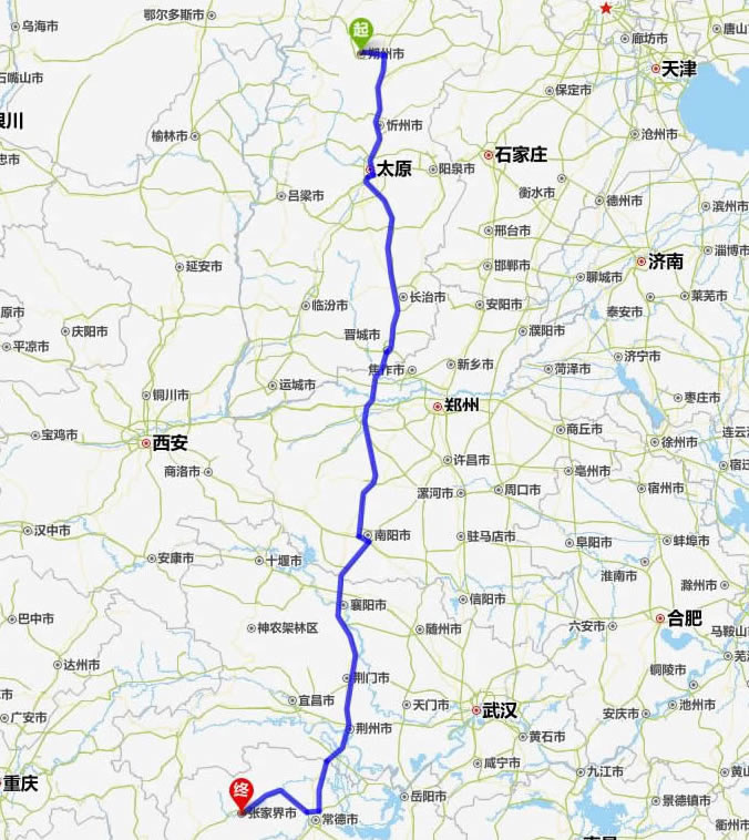 朔州去張家界自駕車自助游線路圖全程高速):
